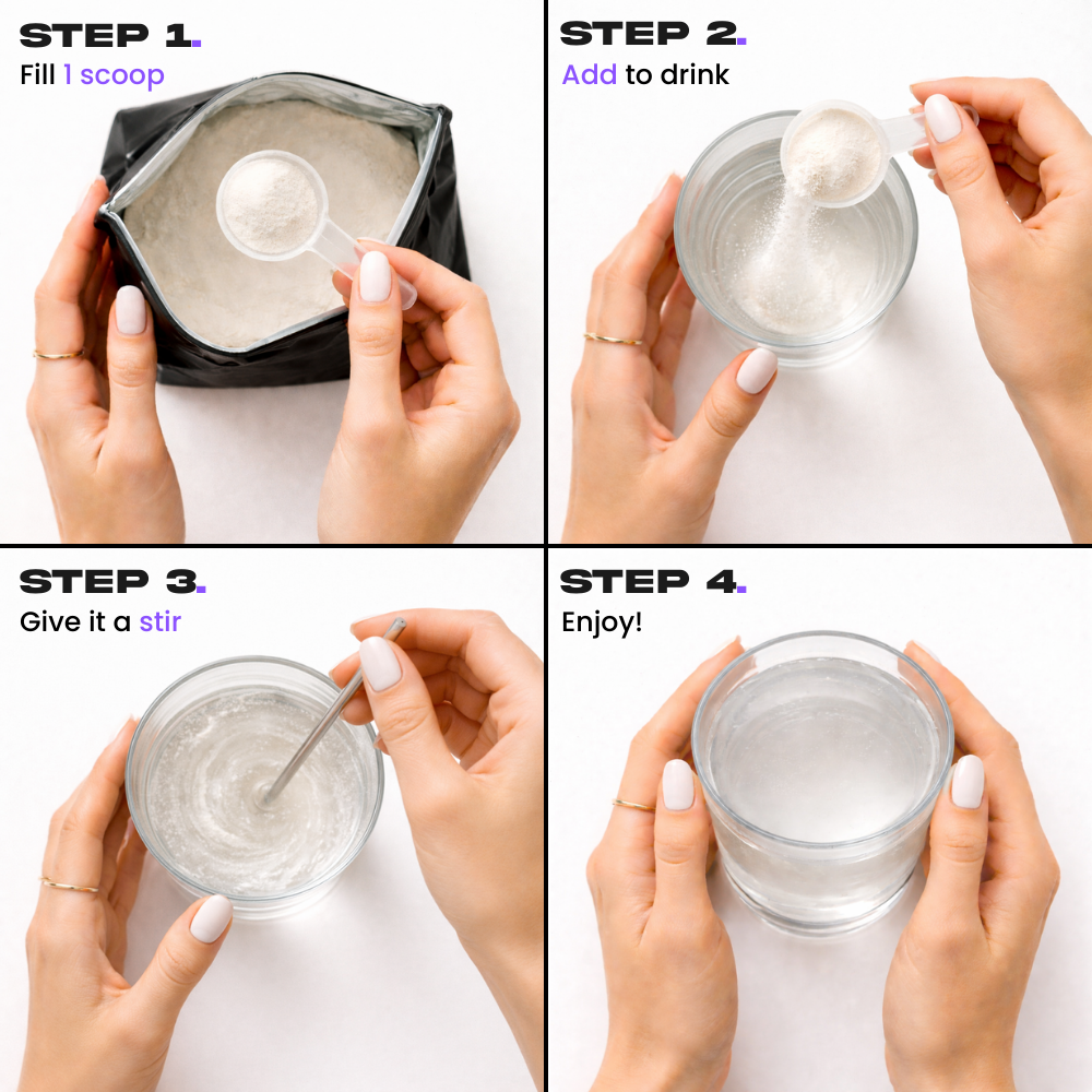 A pure, unflavoured collagen powder designed to fit effortlessly into your daily routine. Mix easily into coffee, water, smoothies, tea or recipes without altering taste.